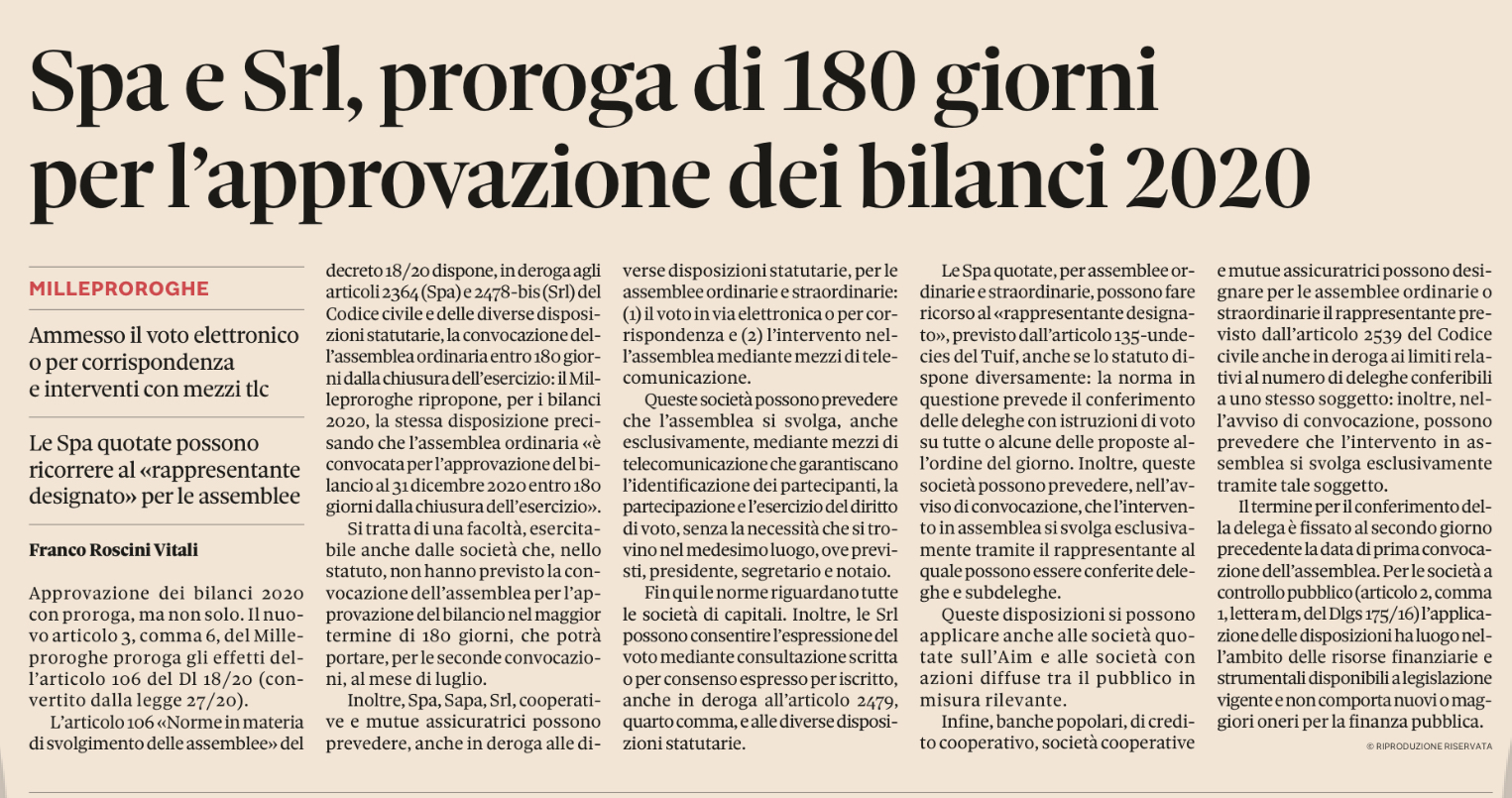 In sede di conversione in legge del DL 183/2020 (c.d. DL “Milleproroghe”), attraverso una modifica all’art. 106 co. 1 del DL 18/2020 convertito, è stato precisato che, in deroga a quanto previsto dagli artt. 2364 co. 2 e 2478-bis c.c., o alle diverse disposizioni statutarie, l’assemblea ordinaria è convocata, per l’approvazione del bilancio al 31.12.2020, entro 180 giorni dalla chiusura dell’esercizio. Si tratta di una facoltà esercitabile anche dalle società che, nello statuto, non contemplino, con riguardo ai casi normativamente previsti, la possibilità di convocare l’assemblea per l’approvazione del bilancio nel maggior termine di 180 giorni; termine che, per le seconde convocazioni, potrà anche slittare al mese di luglio.
